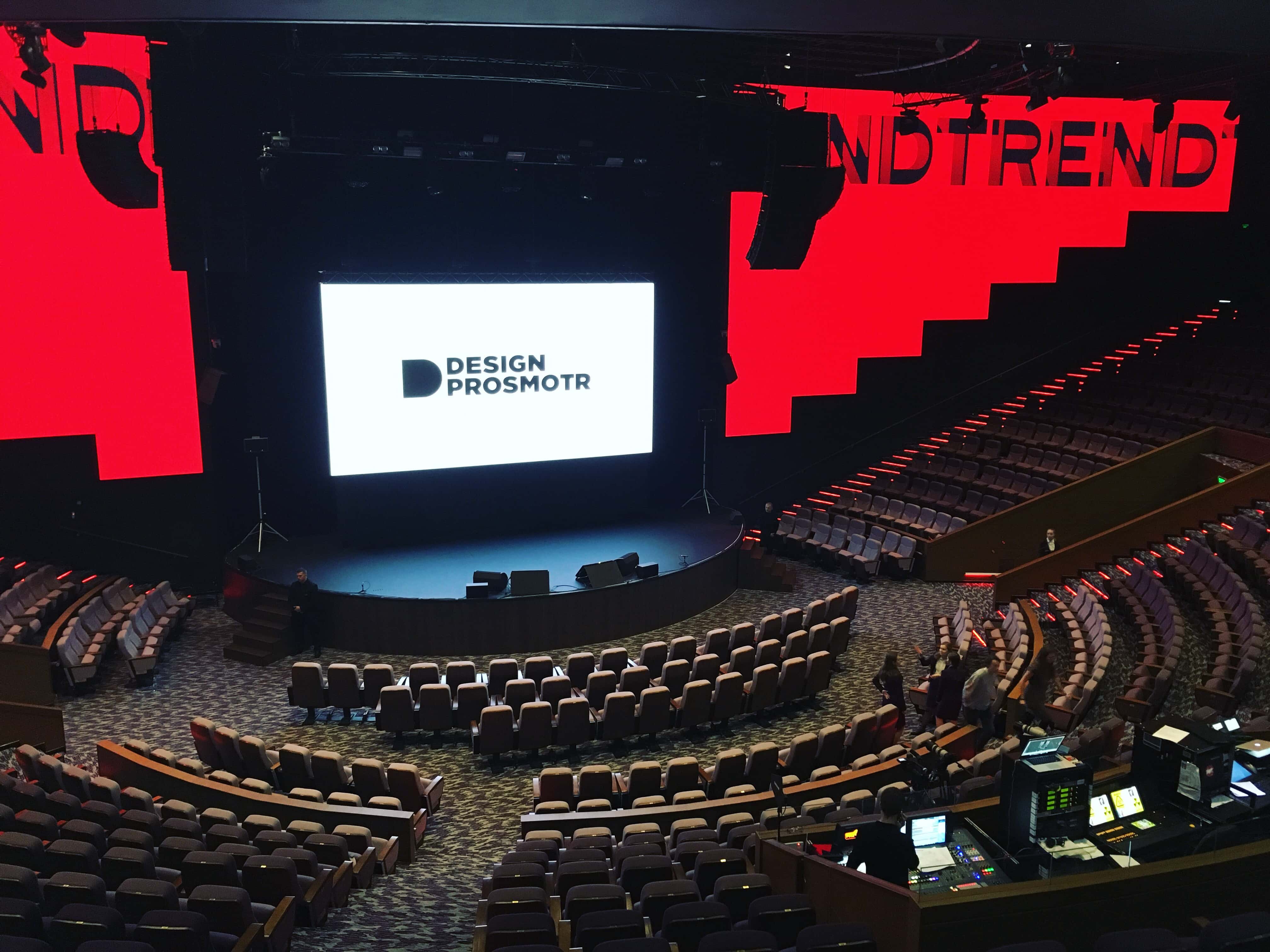 Оформление зала на конференции: красные тона и крутые анимации на экране. Еще понравились тизеры перед выходом спикеров, где в такт музыке показывались их работы.