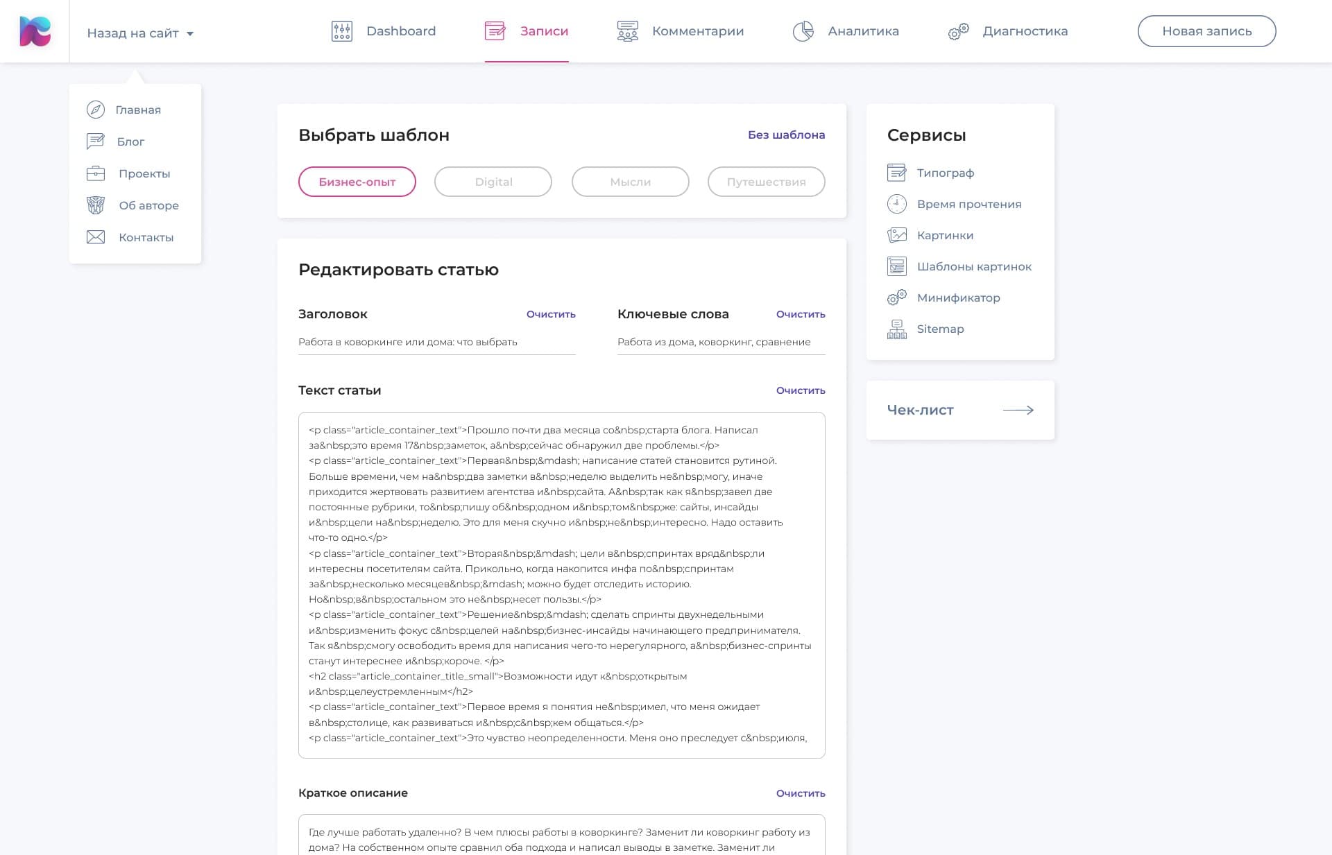 Спроектировал и отдизайнил страницу с добавлением записи в панели управления. Провел UX-анализ самого себя — понял, чем я обычно пользуюсь и как вбиваю информацию из статьи в базу данных. После этого родилась идея вынести полезные сервисы и чек-лист проверки статьи в отдельные блоки на странице. Еще продумал возможность редактировать статьи по шаблону — кликаешь на нужный и все поля на сайте заполняются данными последней статьи по тематике.