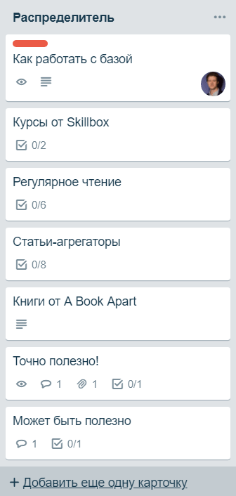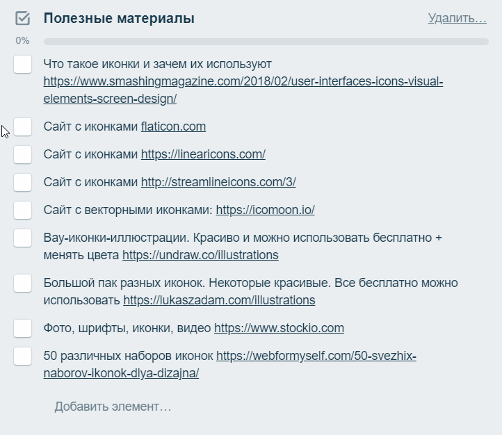 Обычно чек-листы в Trello используются для постановки последовательности из задач. Но и для сбора знаний они отлично подходят: по ссылке можно перейти в один клик, а пункты листа можно менять простым перетаскиванием.