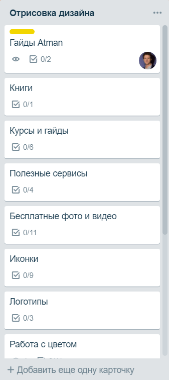 В каждом списке есть как уникальные карточки, так и повторяющиеся. Среди повторяющихся: «Полезные сервисы», «Книги», «Куры и гайды» — для каждого из этапов работы UX / UI дизайнера можно собрать знания такого рода. Среди специальных есть, например, «Бесплатные фото- и видеостоки» и «Бесплатные сервисы иконок» для списка «Отрисовка макета»