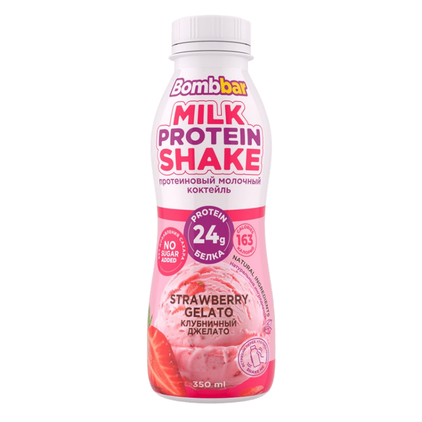 В одной бутылке протеинового коктейля Bombbar Клубничный джелато (350 г) содержится около 24.15 граммов белка (из расчёта 6.90 г на 100 г).