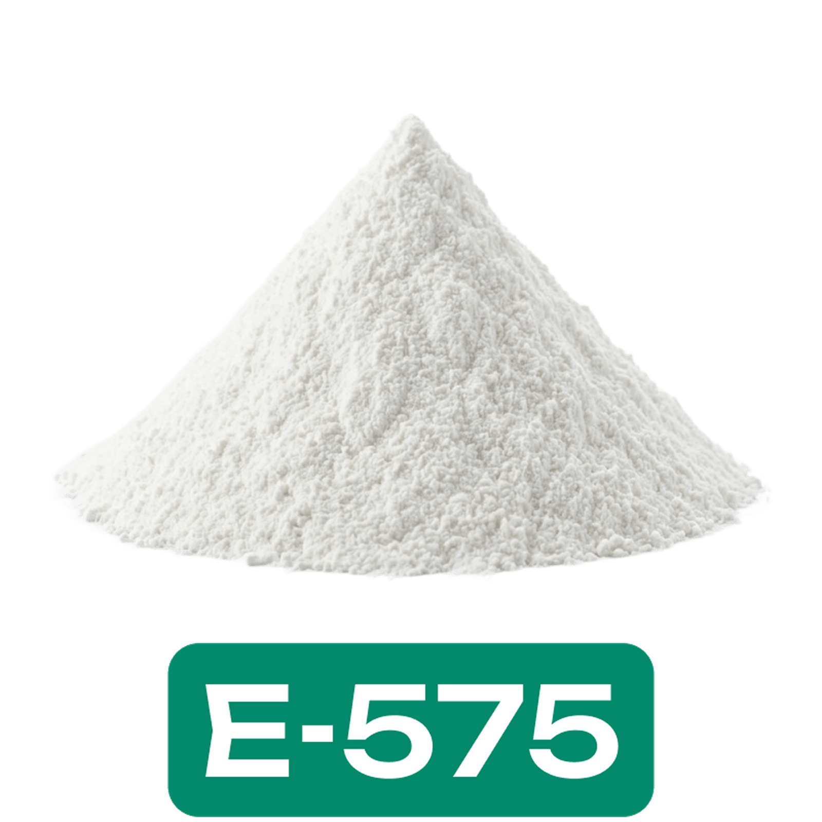 Глюконо-d-лактон (E575) — пищевая добавка, производное глюконовой кислоты. Это белый кристаллический порошок без запаха, хорошо растворимый в воде. Основные функции — регулятор кислотности и антислеживающий агент. Добавка медленно гидролизуется, постепенно повышая кислотность, что полезно для контроля текстуры и процесса загустевания. Применяется в мясных и рыбных продуктах, сырах, кондитерских изделиях, желе и десертах.