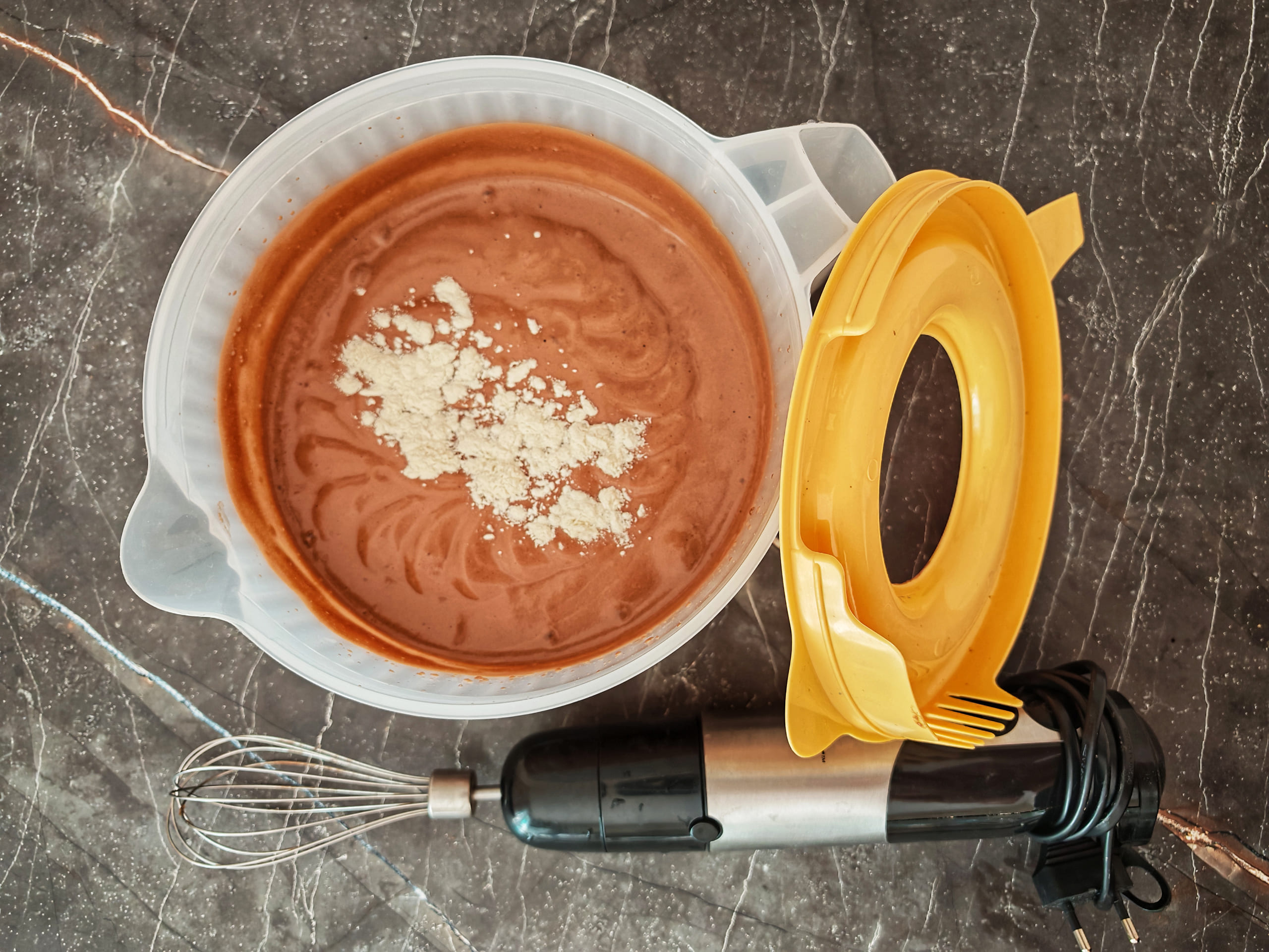 Переместите все ингредиенты, кроме гуаровой камеди, в одну емкость. Последовательность не принципиальна. На взбитие белка это значимо не влияет.