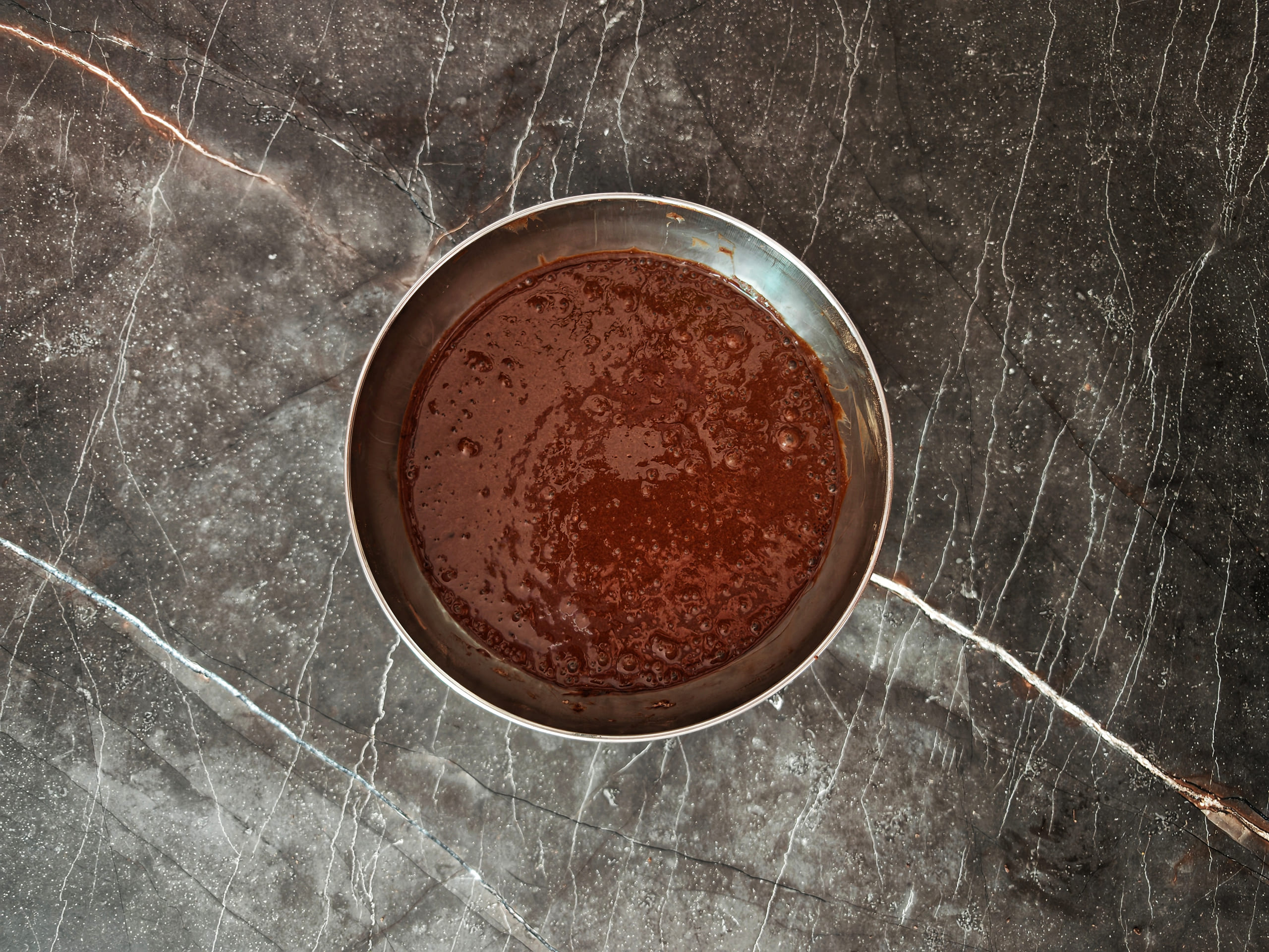 Равномерно распределите смесь на сковороде. Толщина смеси будет определять толщину коржа: можно сделать более объёмный корж для основы торта, а оставшиеся коржи сделать тонкими, как блинчики. Всего из количества смеси в рецепте можно сделать 3-5 коржей диаметра средней сковороды.