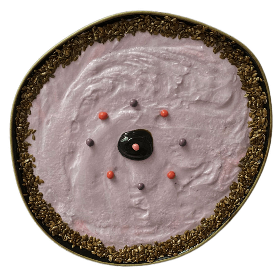 Вариация пуддинга-конструктора: ощущается как сладкий йогурт из магазина, но значительно больше белка и меньше калорий на 100 грамм. Добавлен сахарозаменитель, низкокалорийный топпинг лесные ягоды 4Bakery и декор в виде семян и посыпки. Использован греческий йогурт бренда «Простоквашино» и несколько капель красного фиолетового красителя.