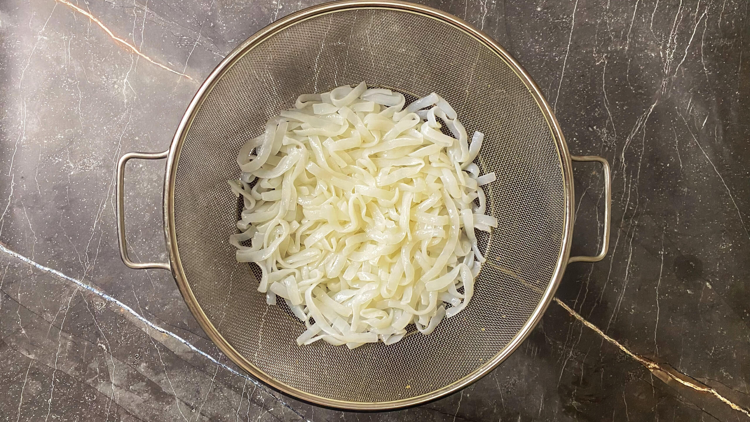 Разместите дуршлаг в раковине или над емкостью, в которую будет собираться жидкость. Извлеките ширатаки из упаковки в дуршлаг. Промойте проточной водой. Желательно дополнительно осушить ширатаки: перемешать лапшу в дуршлаге и дать сойти воде, чтобы излишняя влага не размыла вкус блюда при жарке.