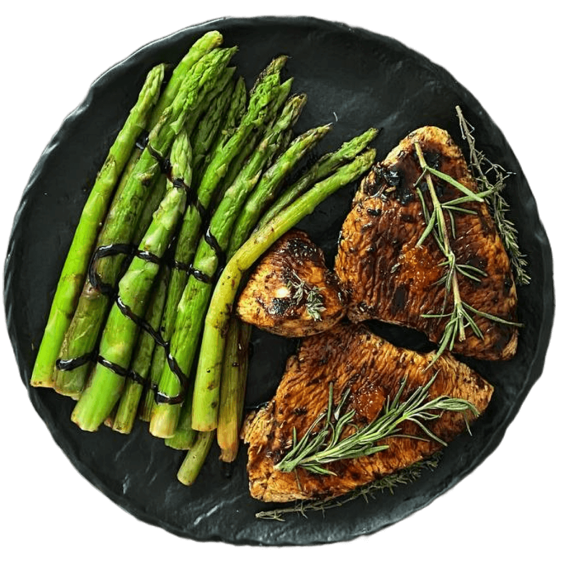 - Текстура: мясная от стейка из индейки, хрустящая и волокнистая от спаржи.