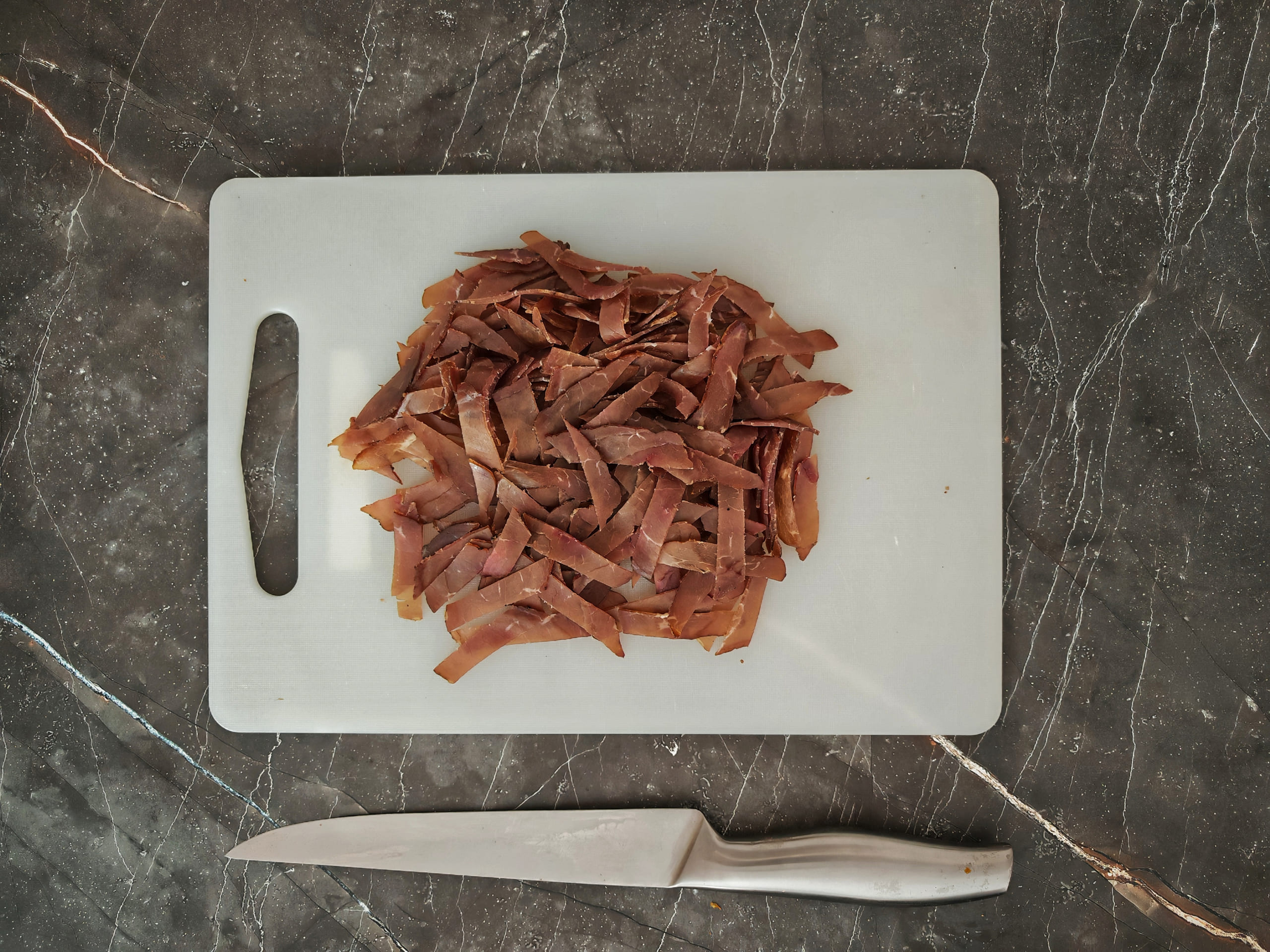 Используйте кулинарный нож и нарежьте мясо на небольшие кусочки для более быстрого обжаривания и удобного потребления.