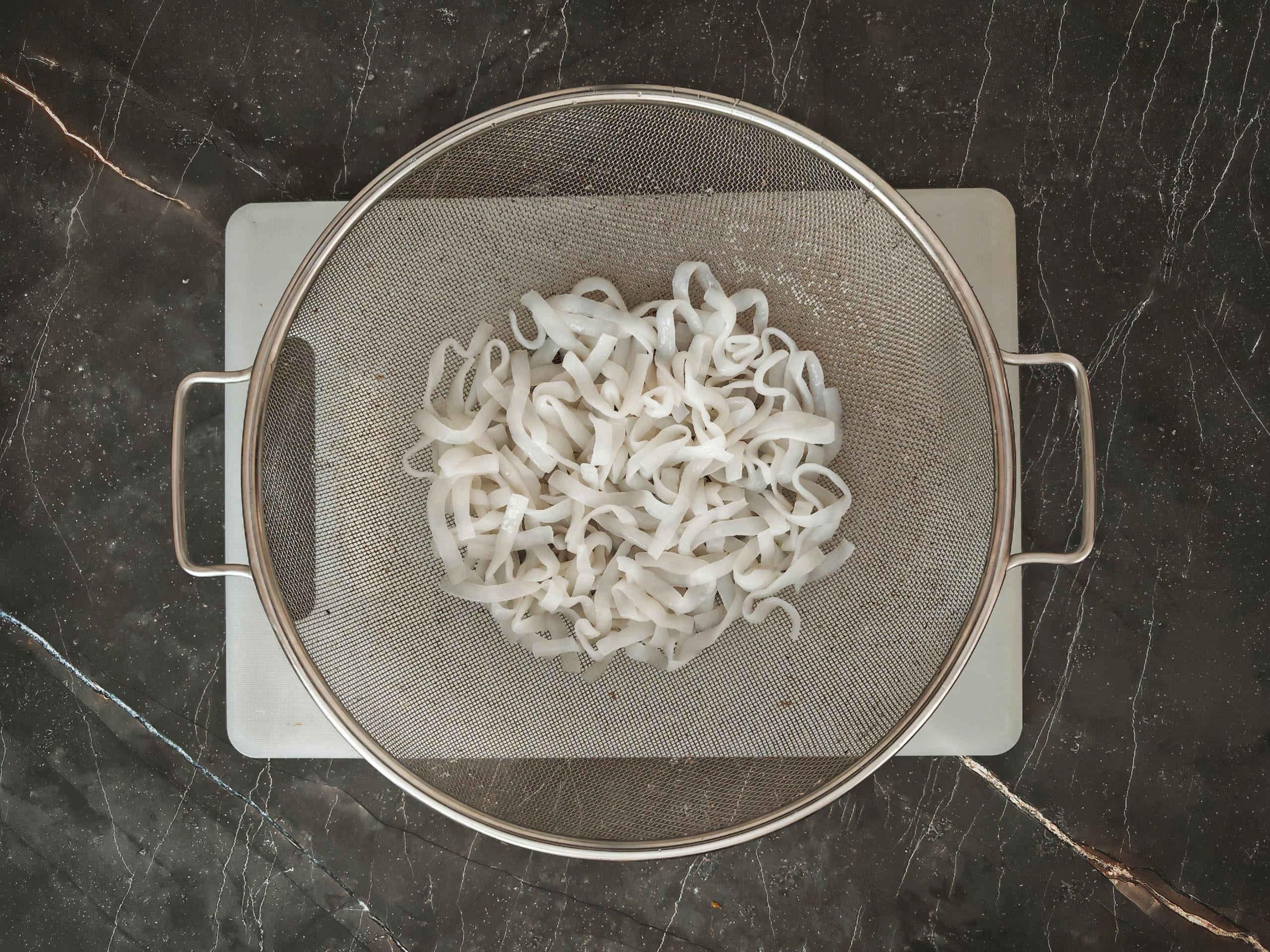 Разместите дуршлаг в раковине или над емкостью, в которую будет собираться жидкость. Извлеките ширатаки из упаковки в дуршлаг. Промойте проточной водой. Желательно дополнительно осушить ширатаки: перемешать лапшу в дуршлаге и дать сойти воде, чтобы излишняя влага не размыла вкус блюда при жарке.