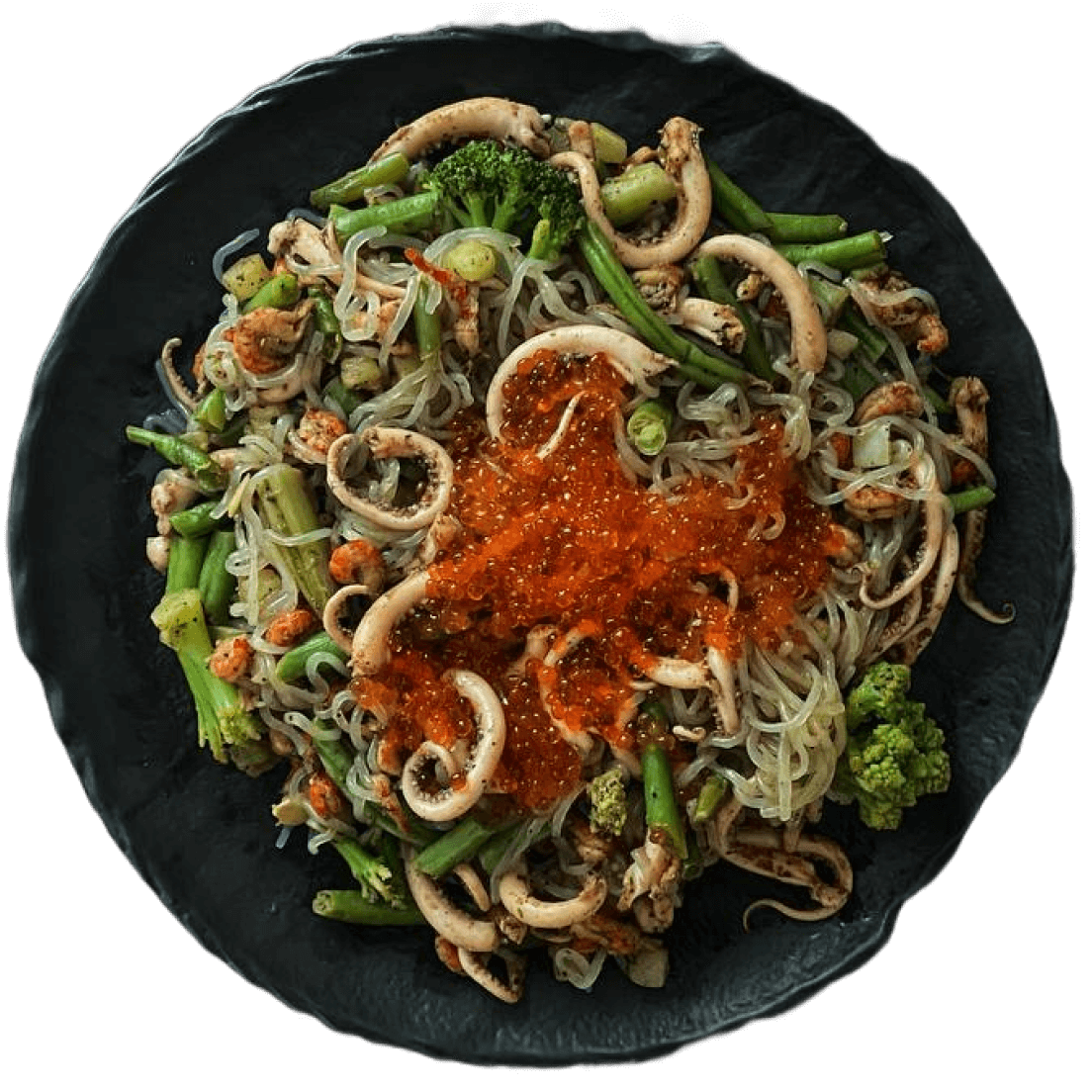 Wok из фетучини ширатаки с овощами и кальмарами