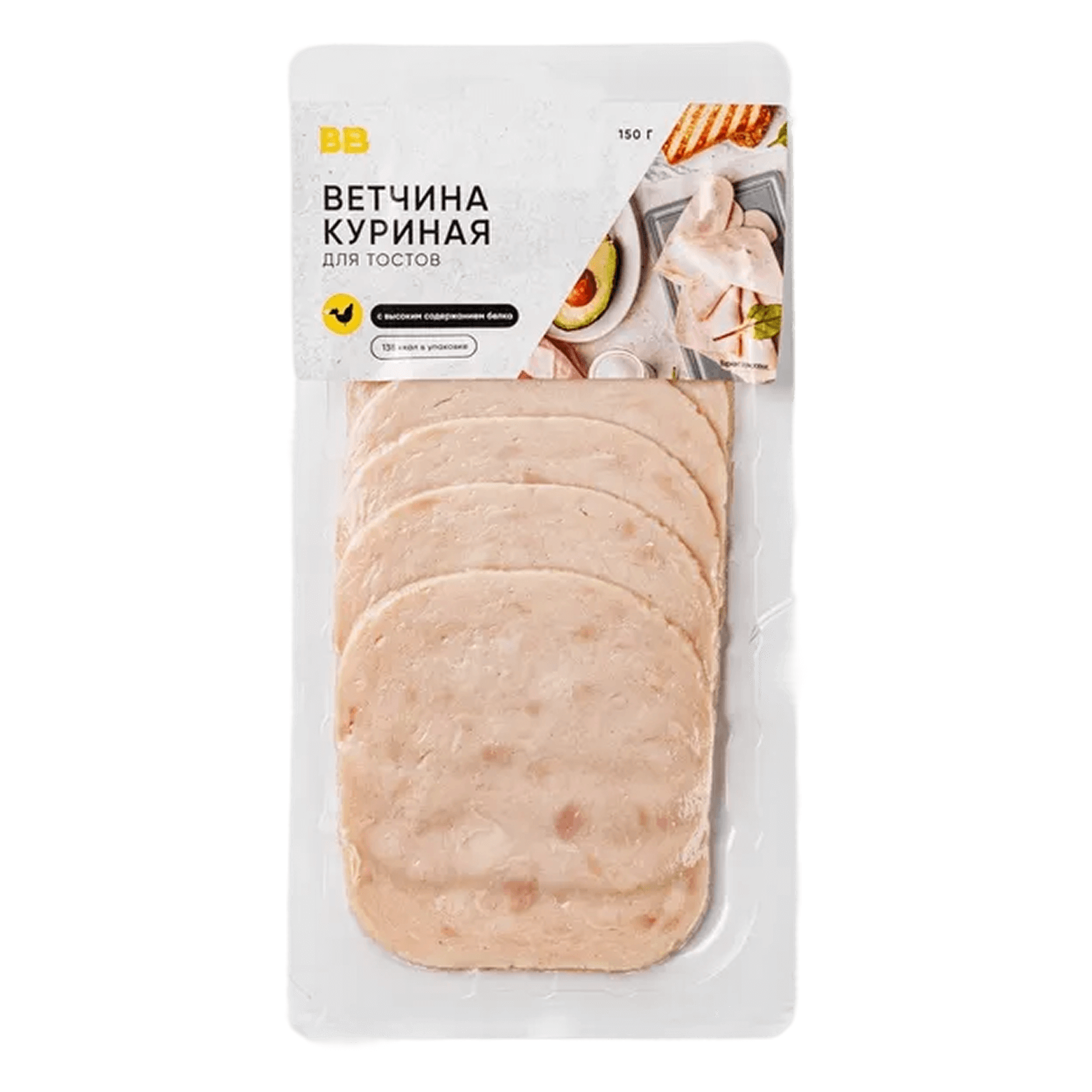 Ветчина приготовлена из свежей куриной грудки, что делает ее особенно нежной и полезной. Специальная форма ломтиков разработана для удобства использования в тостах. Продукт содержит всего 2.3 грамма жиров на 100 грамм, что делает его диетическим. Экстракт мускатного ореха добавляет аутентичную пряность без лишних калорий. Производство контролируется для минимизации содержания соли. Ветчина идеально вписывается в концепцию здорового и быстрого питания.