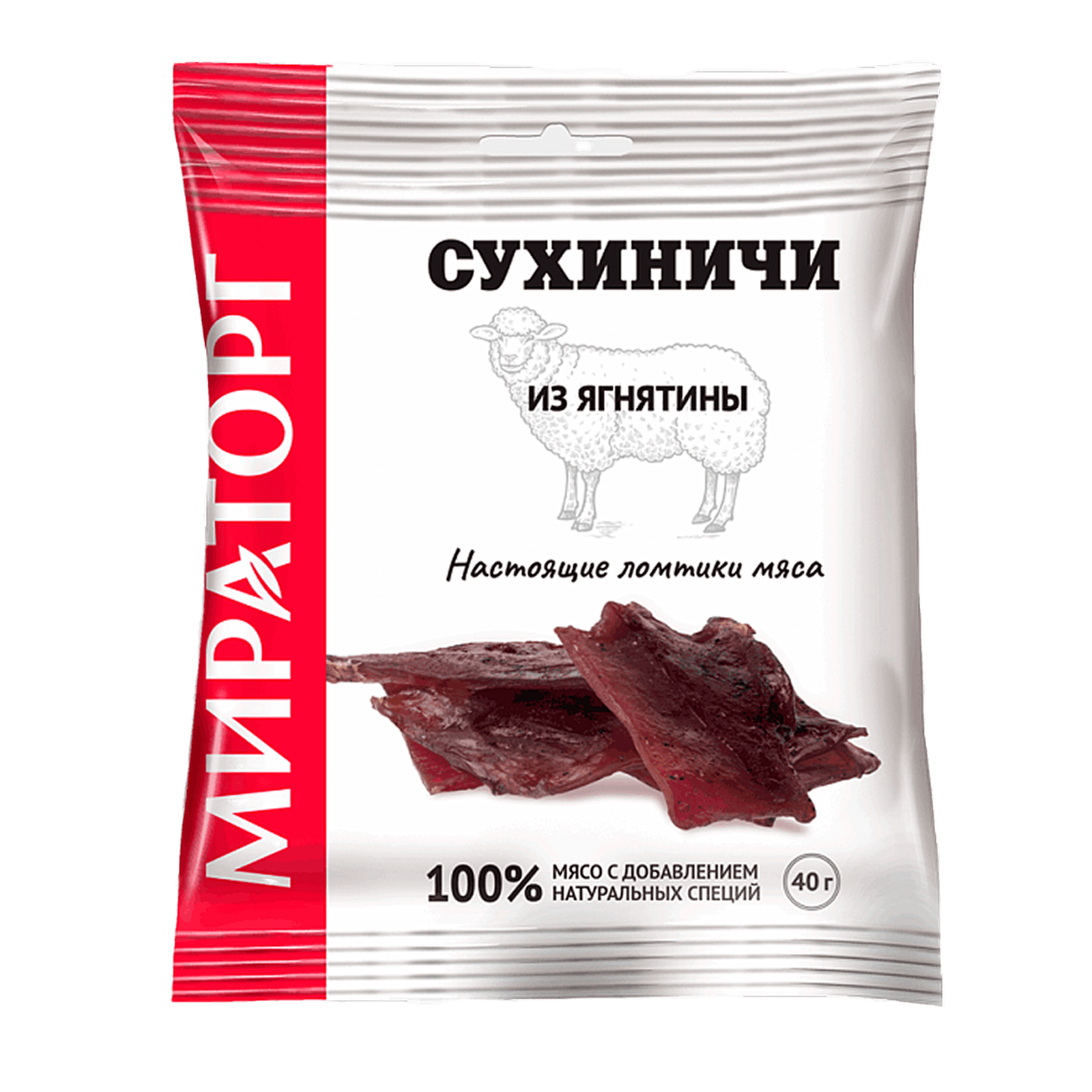 Сухиничи появились в линейке Мираторг в 2018 году как премиальный мясной снек из ягнятины породы Dorper, выращиваемой на собственных фермах компании. Технология основана на традиционных методах сушки мяса, адаптированных к современным стандартам безопасности. Породу Dorper выбрали за нежность мяса и устойчивость к российскому климату. Продукт стал частью стратегии компании по развитию сегмента готовых к употреблению мясных продуктов.
