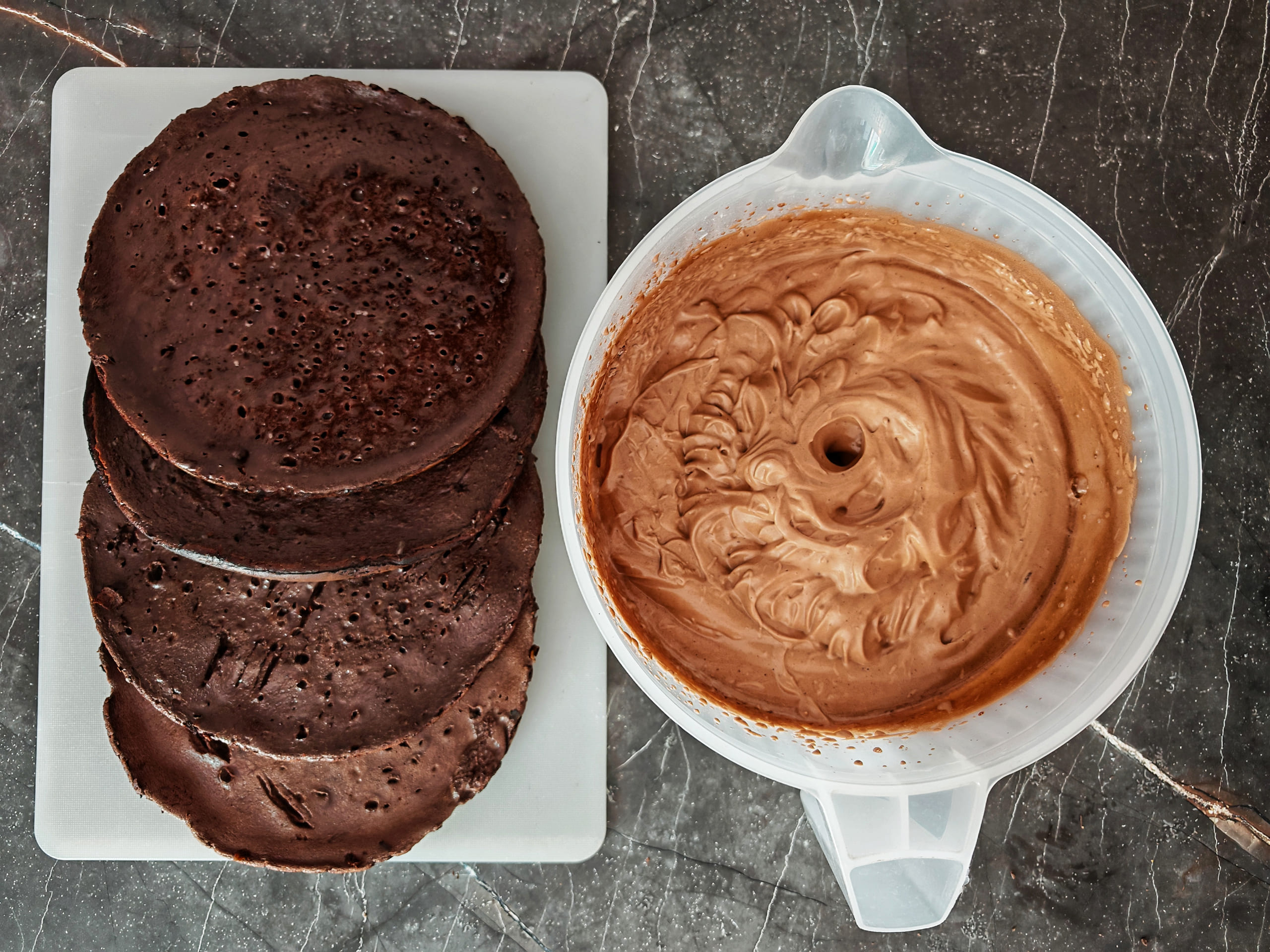 Если один или несколько коржей деформировались в процессе жарки, это не критично. Такой корж можно использовать в середине торта, а снизу и сверху разместить целые коржи.