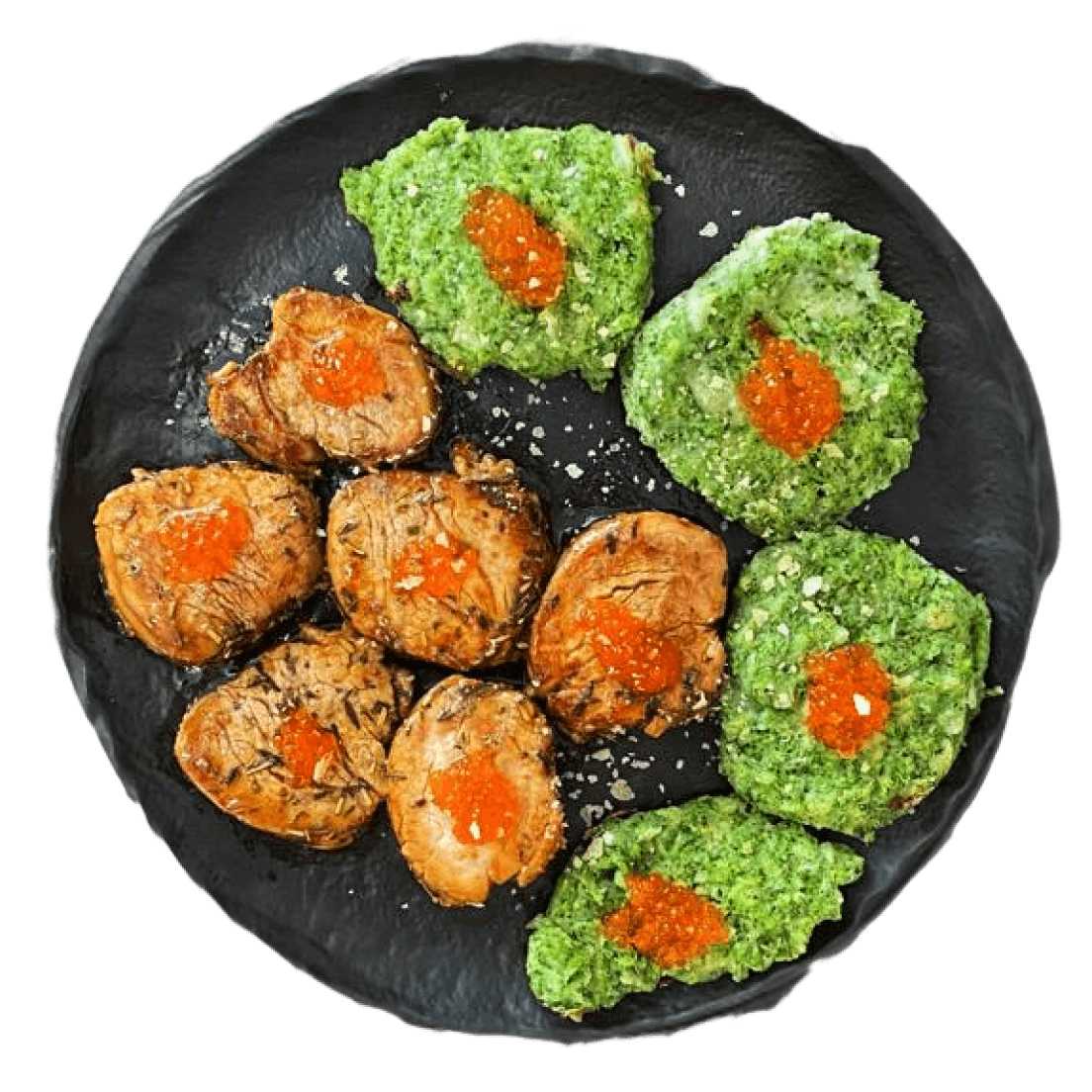 Вариация блюда «Овощи и белок»: гарниром выбраны овощные котлеты, источником белка — медальоны из свинины. Используется сочетание соусов «Кисло-сладкий», «Соевый» и «Чили»: это придало блюду насыщенный кисло-сладкий вкус с небольшой соленостью и остротой. В качестве декора использовалась имитация лососёвой икры и пищевые дрожжи.