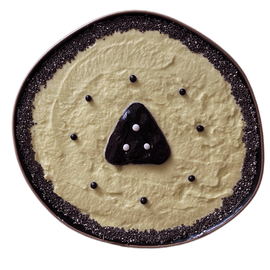 Для декорирования семенами удобно использовать ложку с носиком. Сперва набрать в нее семена, затем направить к грани тарелки и перемещать по кругу, одновременно постукивая по ложке пальцем. Чтобы разместить посыпку более точно, удобно использовать кулинарный пинцет. На этом процесс завершен, блюдо готово к употреблению!