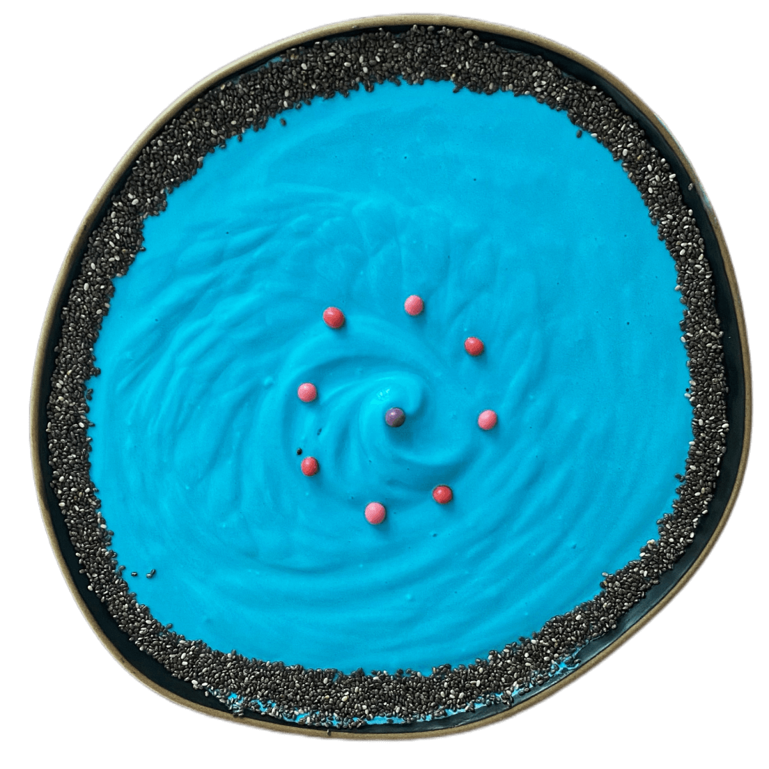 Вариация пуддинга-конструктора: ощущается как сладкий йогурт из магазина, но значительно больше белка и меньше калорий на 100 грамм. Добавлен сахарозаменитель, низкокалорийный топпинг Блю Кюрасао 4Bakery и декор в виде семян и посыпки. Использован греческий йогурт бренда «Neo» и несколько капель синего пищевого красителя.