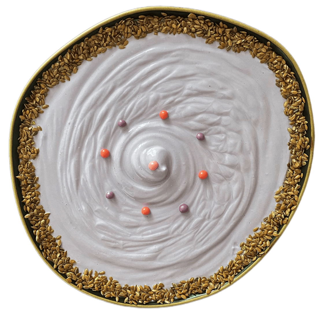 Вариация пуддинга-конструктора: ощущается как сладкий йогурт из магазина, но значительно больше белка и меньше калорий на 100 грамм. Добавлен сахарозаменитель, низкокалорийный топпинг лавандовый 4Bakery и декор в виде семян и посыпки. Использован греческий йогурт бренда «Neo» и несколько капель фиолетового пищевого красителя.
