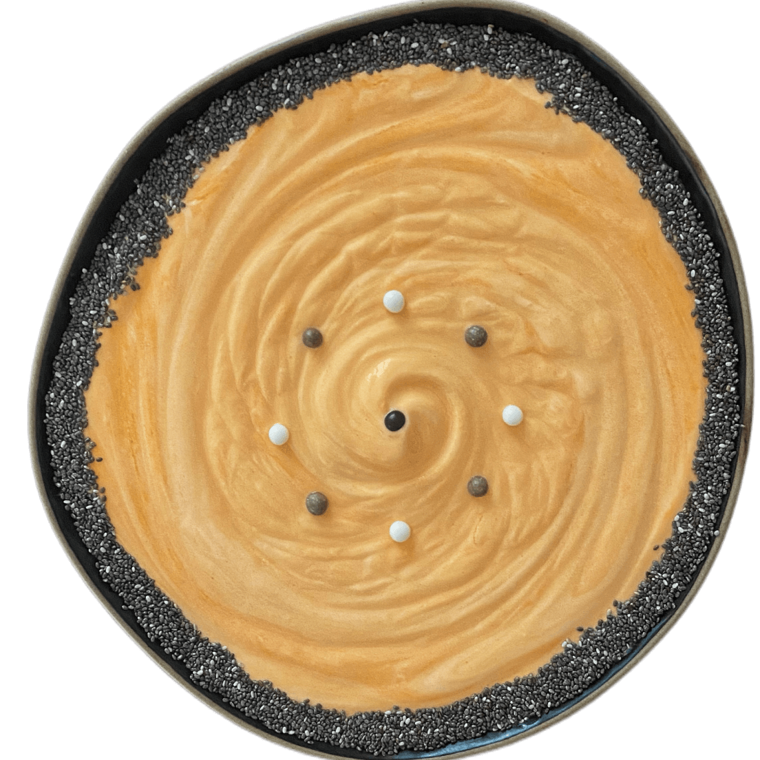Для декорирования семенами удобно использовать ложку с носиком. Сперва набрать в нее семена, затем направить к грани тарелки и перемещать по кругу, одновременно постукивая по ложке пальцем. Чтобы разместить посыпку более точно, удобно использовать кулинарный пинцет. На этом процесс завершен, блюдо готово к употреблению!