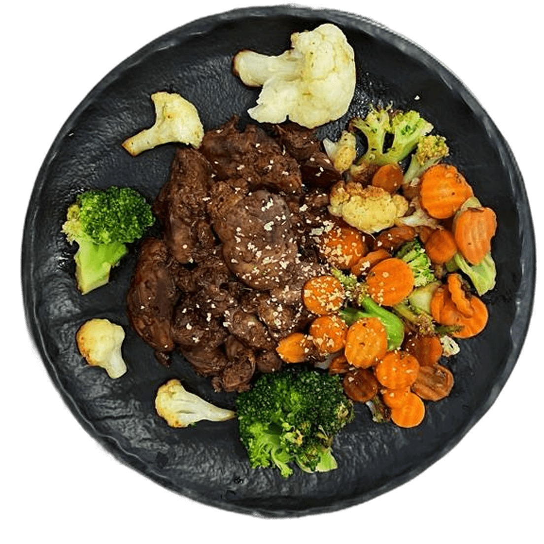 Вариация блюда «Овощи и белок»: гарниром выбрана овощная смесь, источником белка — печень птицы. Понравилось сочетание соусов и раскладка овощей на тарелке.