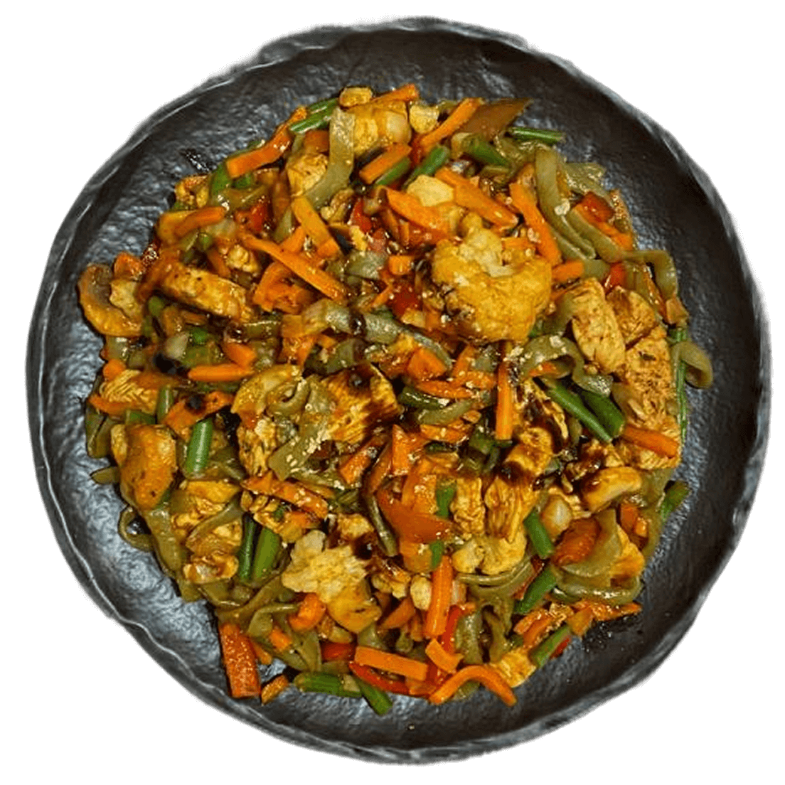 Wok из спагетти ширатаки с овощами и фаршем из индейки