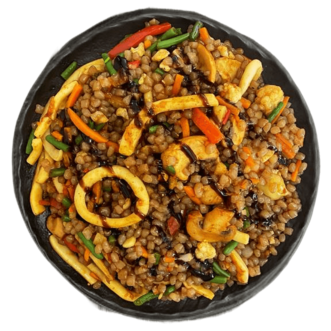 Вариация Wok-конструктора: гарниром выбраны ширатаки и овощная смесь, источник белка — индейка.