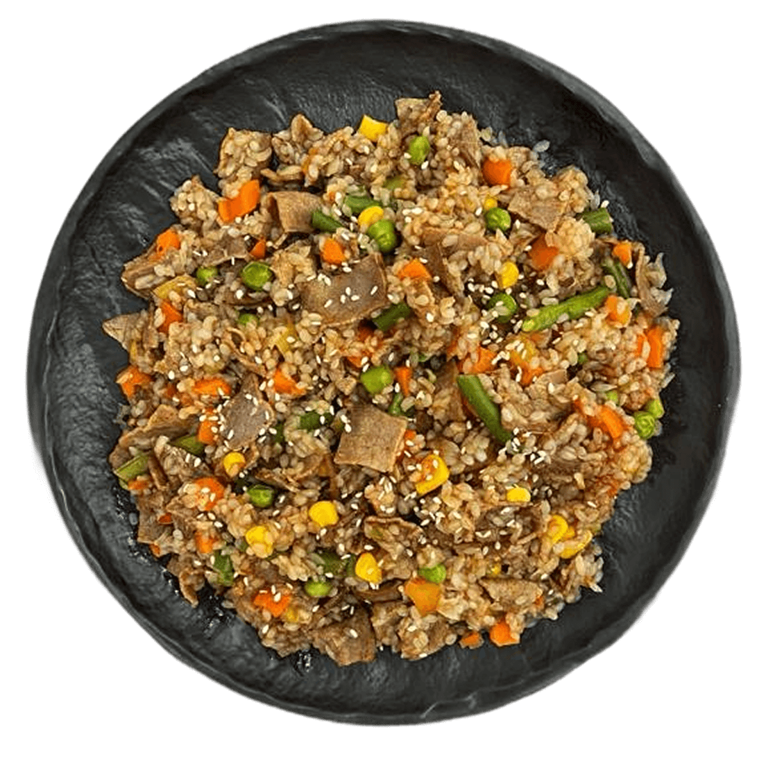 Понравилось сочетание овощной смеси из небольших кусочков, небольшие кусочки мясной нарезки и ширатаки в форме риса. Хаотичная посыпка кунжутом выглядит приятно.