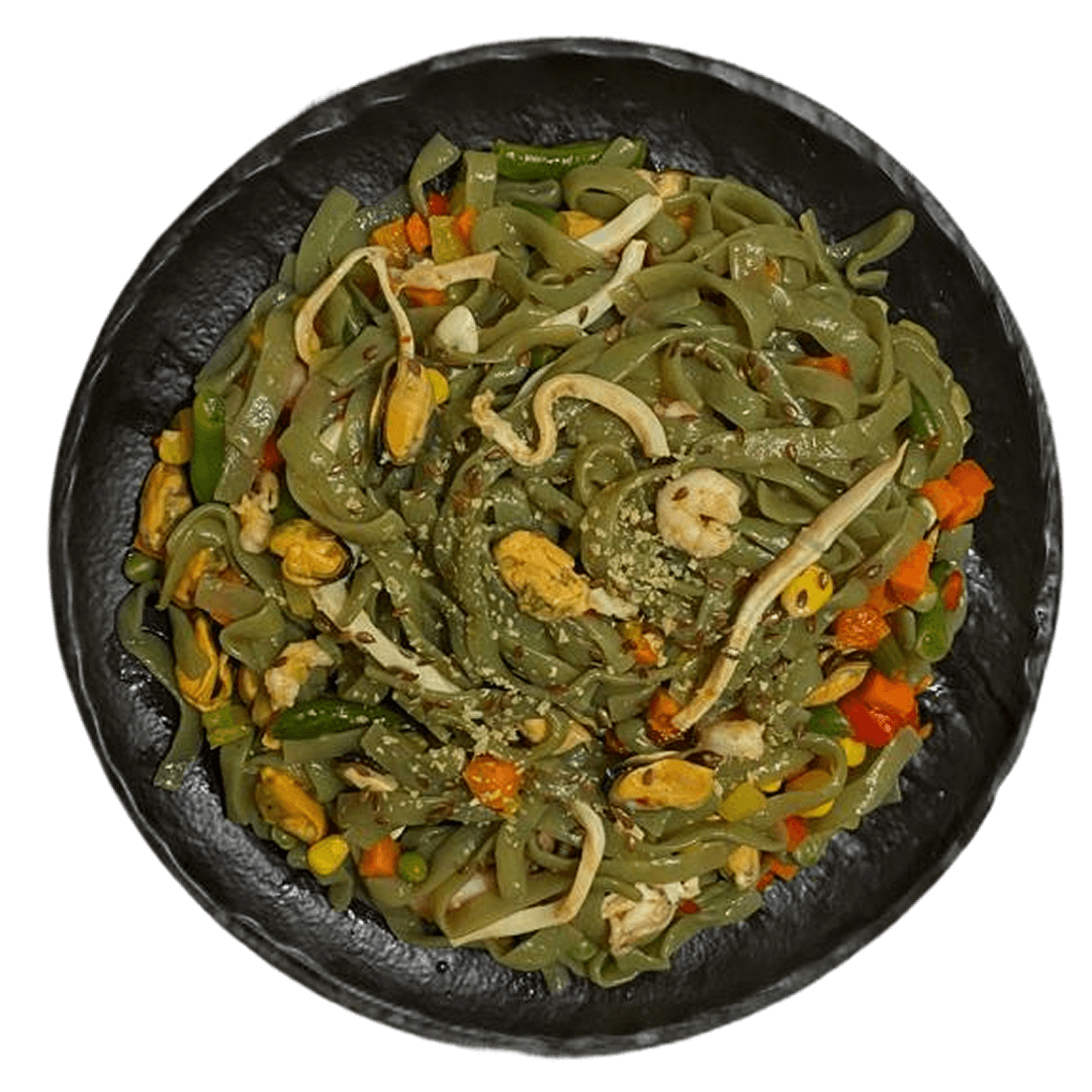 Вариация Wok-конструктора: гарниром выбраны ширатаки и овощная смесь, источником белка — морепродукт.