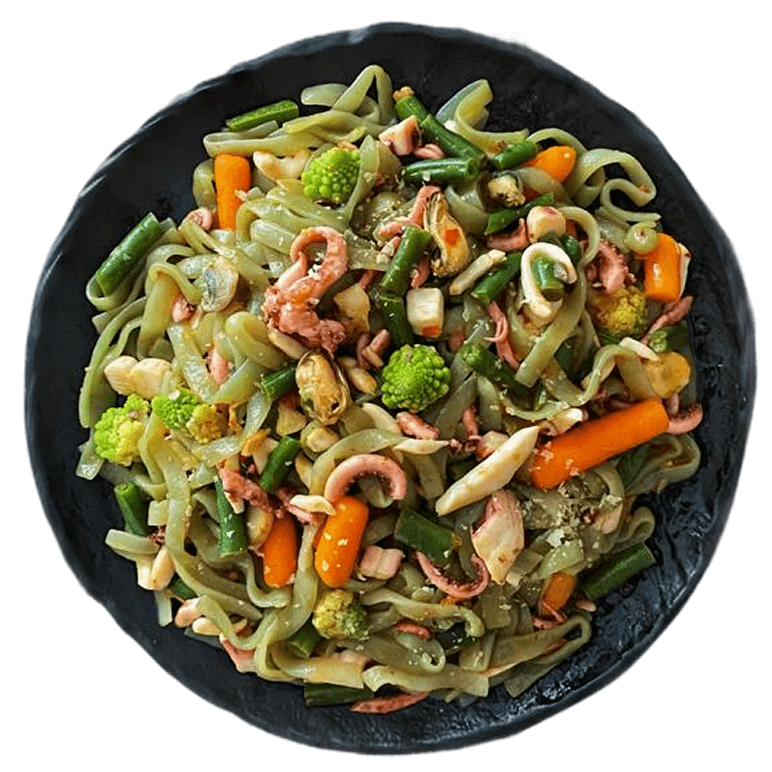Wok из фетучини ширатаки с овощами и кальмарами
