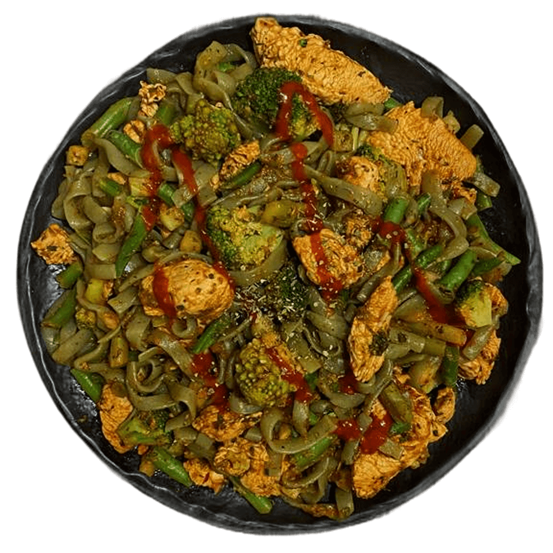 Wok из фетучини ширатаки с овощами и мясной нарезкой