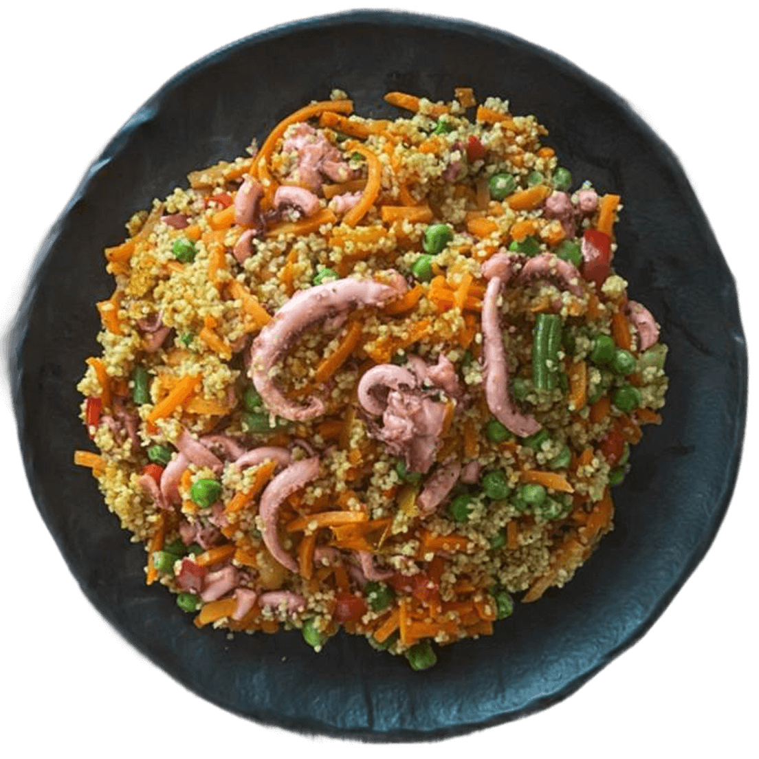 Вариация Wok-конструктора: гарниром выбрана замороженная смесь с овощами, источником белка — морепродукт.