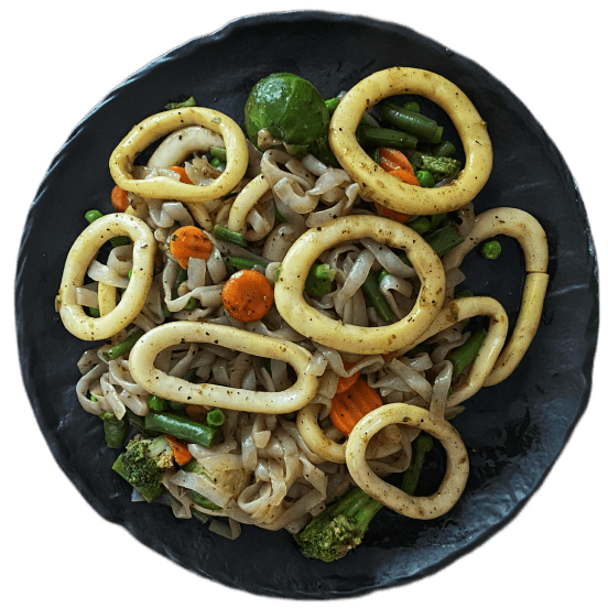 Wok из фетучини ширатаки с овощами и кальмарами