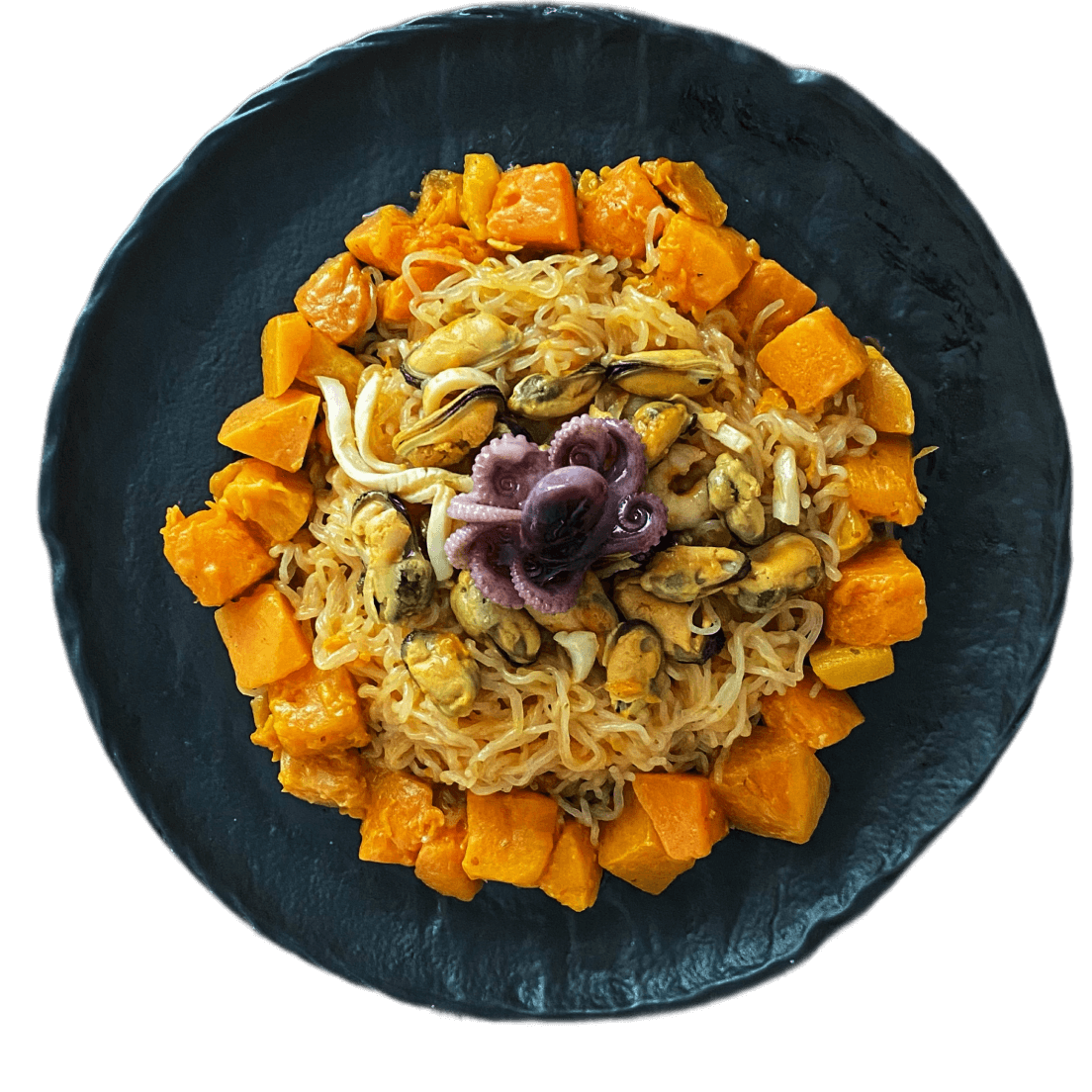 Wok из фетучини ширатаки с овощами и кальмарами